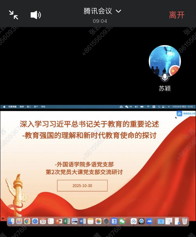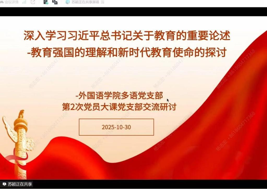 2025年10月30日,外国语学院多语党支部召开线上会议,专题学习习近平总书记关于教育的重要论述,深入探讨教育强国如何支撑引领中国式现代化。会议由支部书记苏颖主持,全体党员教师参加。