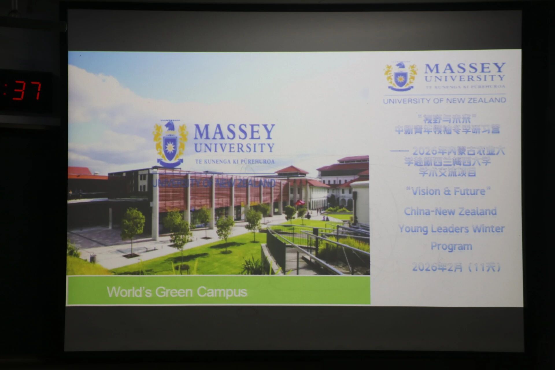 11月5日,2026年内蒙古农业大学赴新西兰梅西大学学术交流项目——“视野与未来”中新青年领袖冬季研习营讲座,在东校区主教学楼208教室举行。我院邀请国际教育学院白婧老师前来讲座,外国语学院学生代表积极参加。讲座旨在通过介绍该项目,帮助同学们拓宽学习领域,开阔专业视野,了解多元文化,培育就业观念,进而推动自身的全面发展。