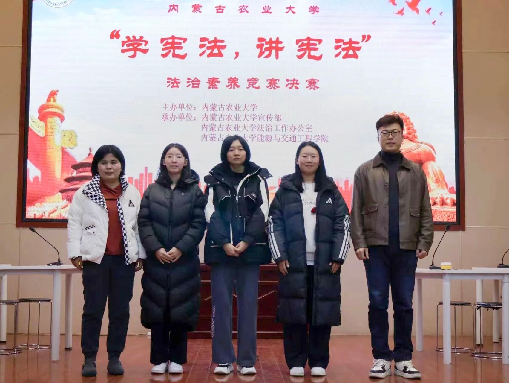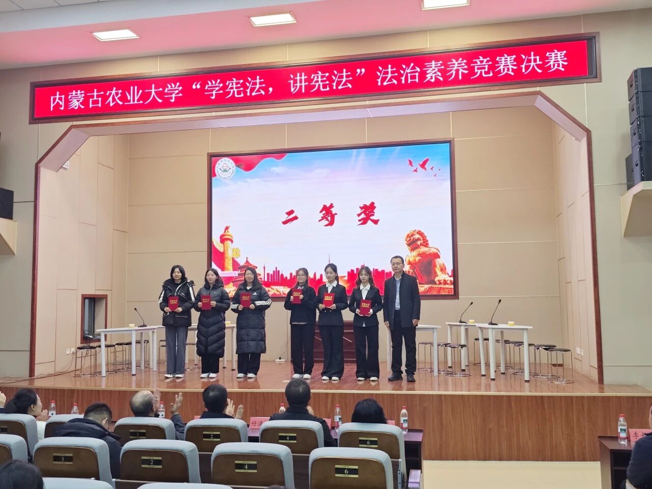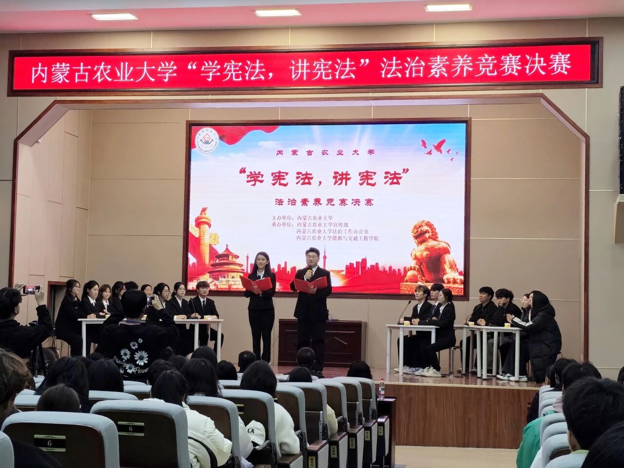 11月11日,内蒙古农业大学西校区礼堂内气氛热烈,由内蒙古农业大学主办,内蒙古农业大学宣传部、法制工作办公室和能源与交通工程学院承办的“学宪法,讲宪法”法治素养竞赛决赛正式举行。来自各学院的6支代表队同台竞技,围绕宪法知识、法治理念展开激烈角逐,最终外国语学院代表队凭借扎实的知识储备与默契配合,斩获二等奖的优异成绩。