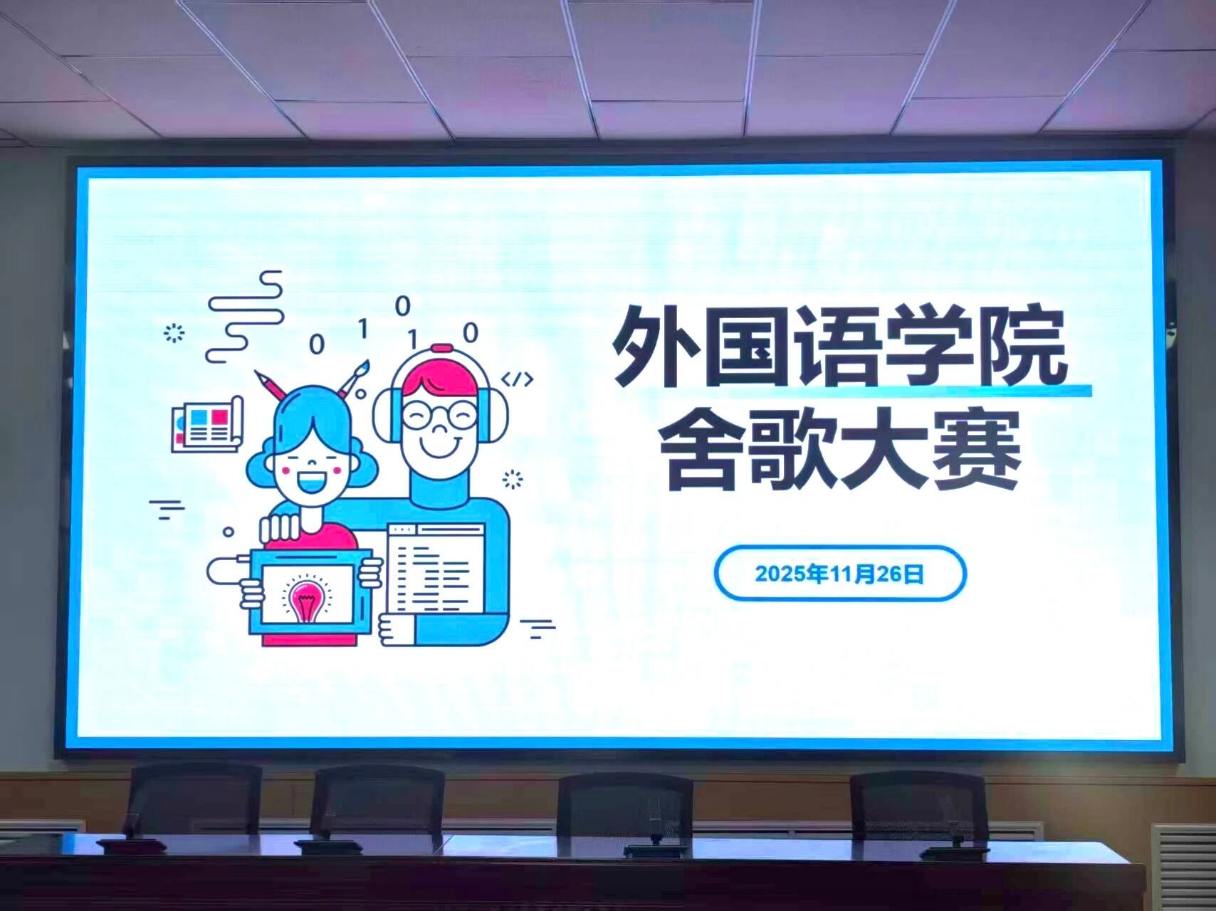2025年11月26日,我院在二楼会议室成功举办“外国语学院舍歌大赛”。本次大赛以“青春旋律、和谐篇章”为主题,旨在鼓励同学们积极参与校园文化活动,推动宿舍和谐氛围及心理健康建设。活动吸引了学院各年级同学踊跃参加。