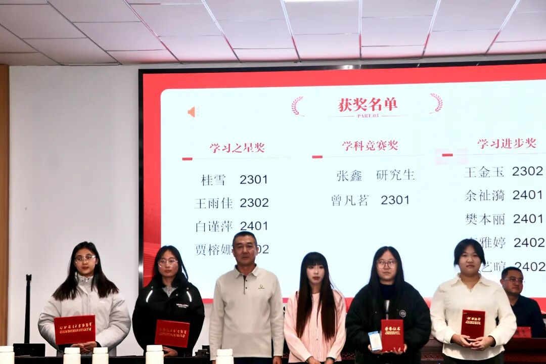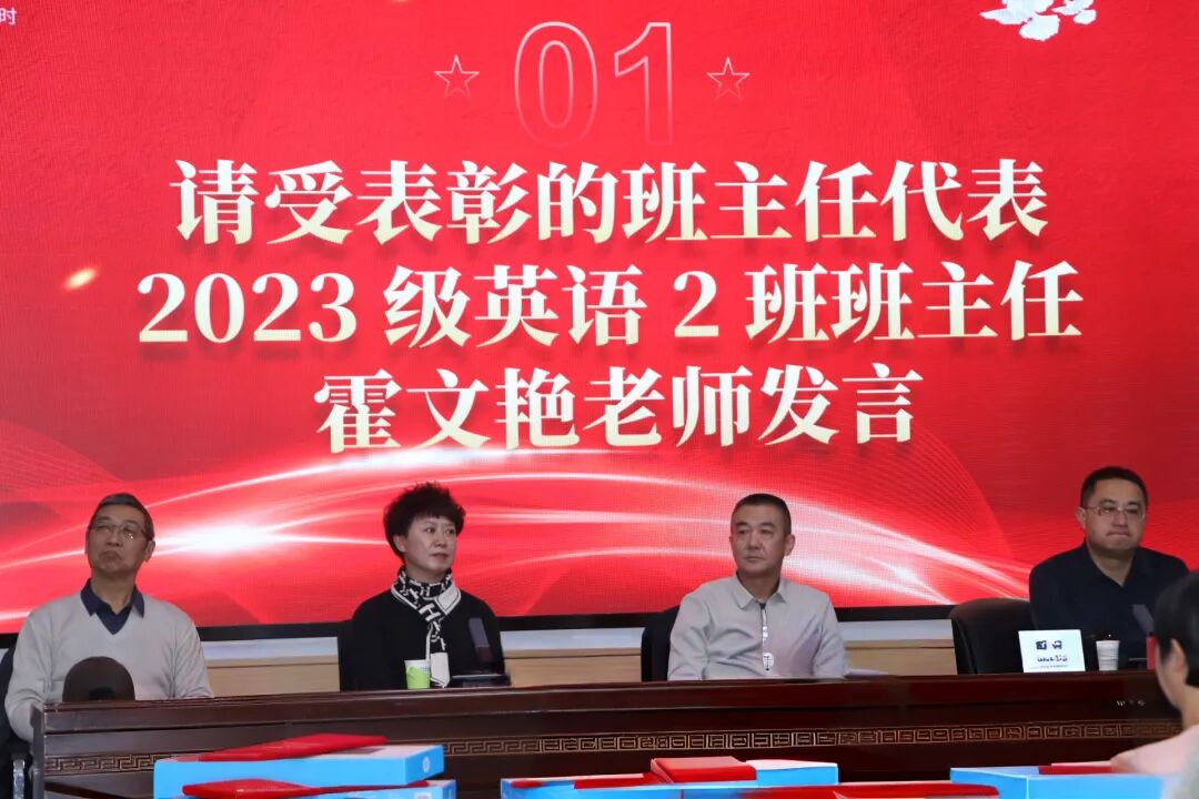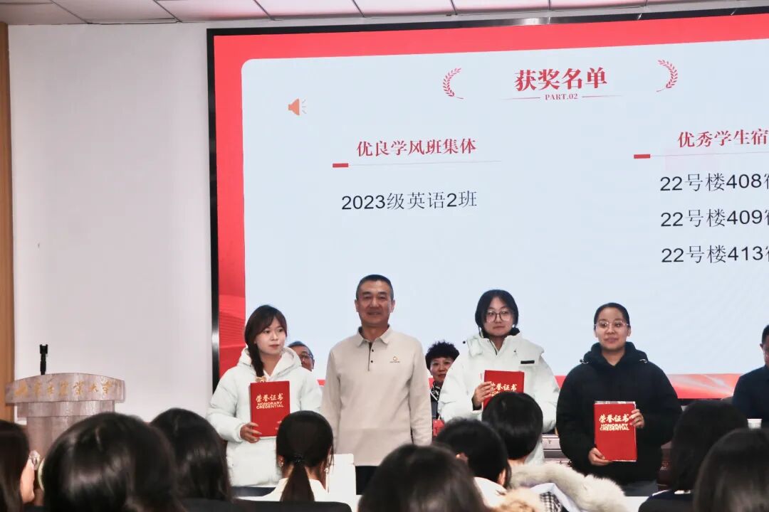 2025年12月4日,外国语学院学风表彰大会于学院二楼会议室隆重举行。内蒙古农业大学学生工作部副部长张鹏飞,外国语学院党委书记曹立军,副院长任云岚,关心下一代委员会常务副主任冯利四位领导莅临现场,与各班主任、获奖学生及学生代表共同见证了这一荣誉时刻。