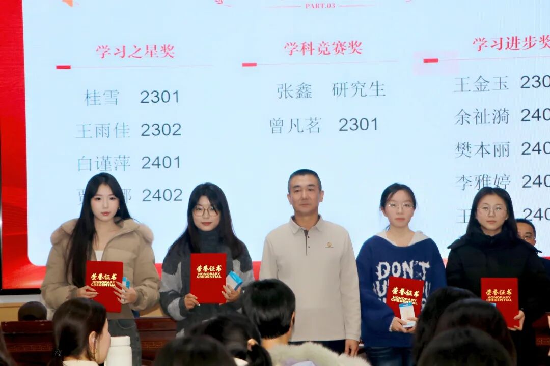 学校学生工作部副部长张鹏飞老师首先为“先进集体”与“先进个人”获奖代表颁奖。随后,学院党委书记曹立军老师为“优秀学风班级”“先进宿舍”颁奖,并揭晓了“学习之星”“学科竞赛奖”“学习进步奖”获奖名单。“学习之星”们以专注为笔,书写专业学习的优异答卷;“学科竞赛奖”得主们将理论化为实践,在挑战中创新突破,展现了外院学子的锐气与实力。