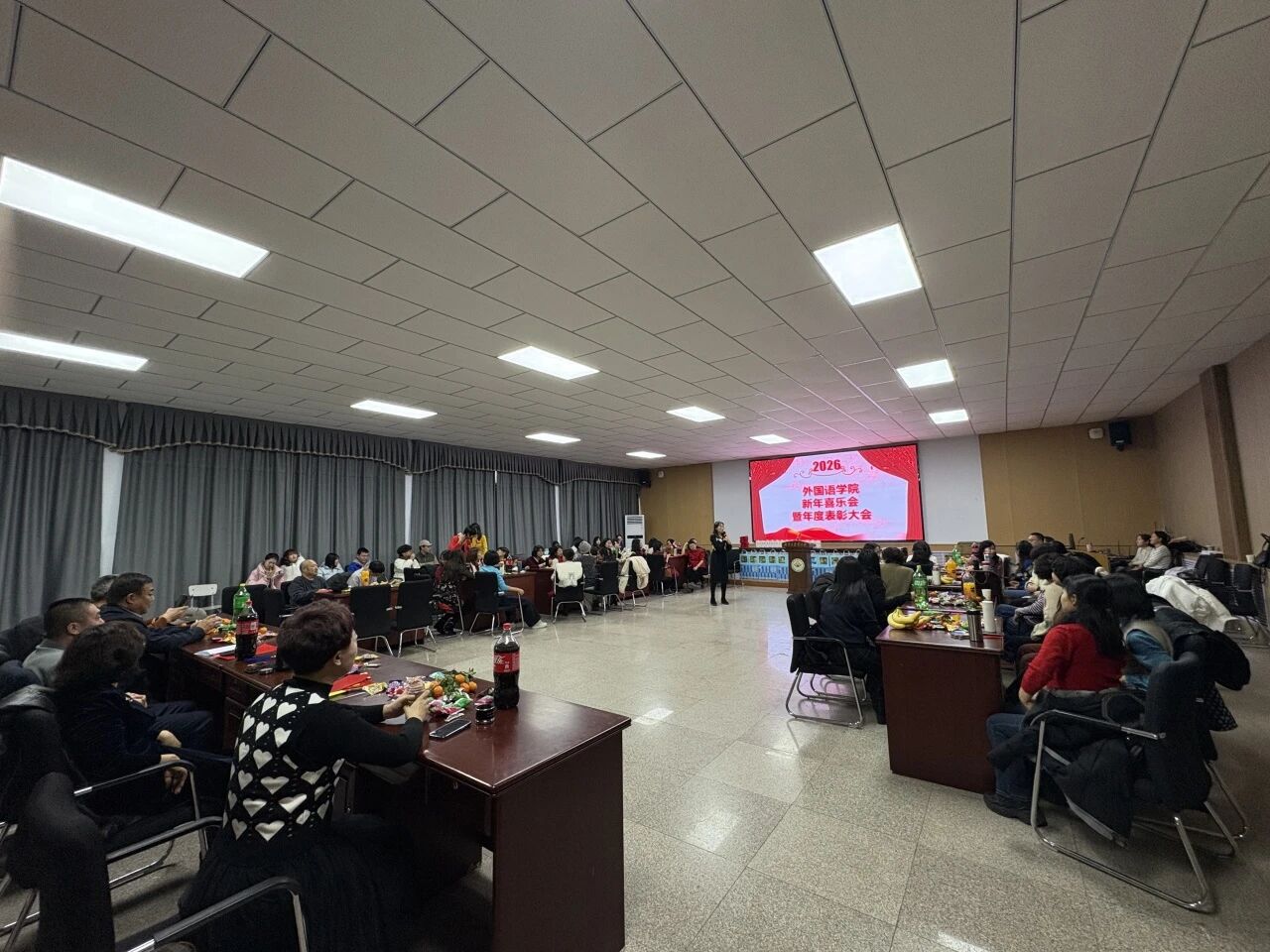 时光荏苒,岁律更新。为喜迎元旦佳节,丰富师生校园文化生活,展现外语学院师生同心奋进的良好氛围,外国语学院2026年新年喜乐暨2025年度表彰大会于12月26日下午顺利举行。院党委书记曹立军,院长刘翠兰,副院长任云岚,组织员靳国斌,关工委常务副主任冯利等出席大会,与学院师生共迎新年。