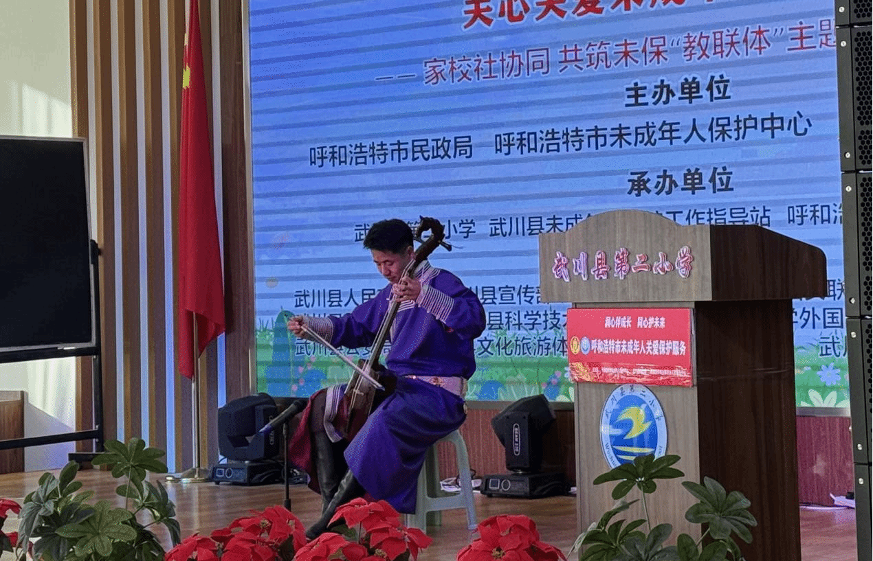 活动在悠扬的马头琴曲《凯旋》中拉开帷幕,学院社会服务队代表与武川县人民政府、民政局、教育局等相关单位负责人、学校师生及家长代表齐聚一堂,共话未成年人保护责任。在发言环节,服务队代表大学英语第一教研室主任及党支部书记王兴刚同志立足高校育人使命,充分肯定了武川县未成年人保护工作站的扎实成效,强调未成年人是国家未来与民族希望,高校作为社会力量的重要组成部分,理应主动融入未保工作体系,以专业服务为县域未成年人成长保驾护航。同时寄语孩子们树立远大理想,在关爱中茁壮成长,争做担当民族复兴大任的时代新人。